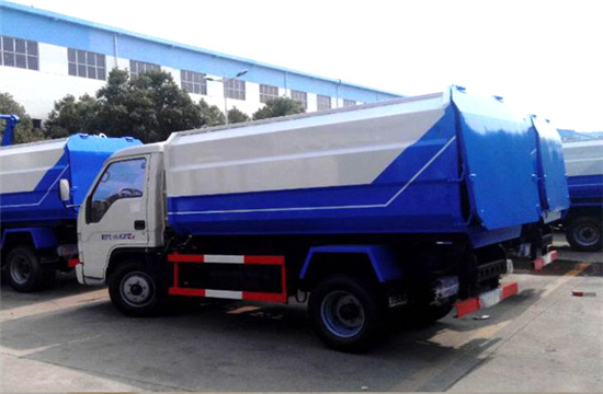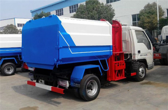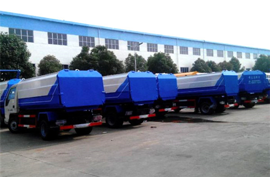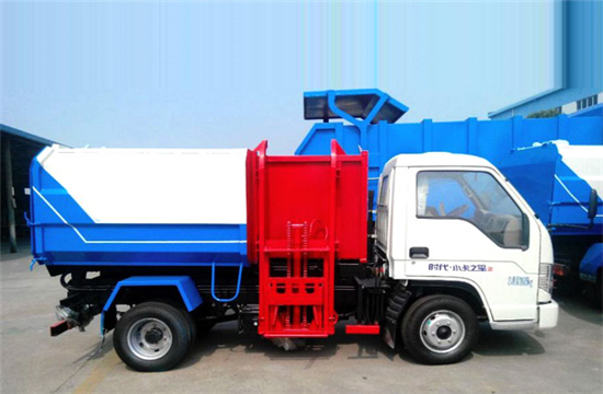 工作原理:自装卸式垃圾车是由密封式垃圾厢、液压系统、操作系统组成,能配几十个垃圾桶,实现一车与多个垃圾桶联合作业,厢体上的液压升降装置可将垃圾桶吊上、放下,上下升降,上下一次工作循环时间为50S,密封式厢体环保卫生,可避免二次污染。其自装式的挂桶装置可直接将路边的垃圾桶挂在上面用提升机直接到在垃圾箱体里面省去了装垃圾的麻烦。