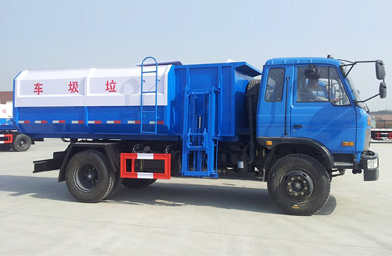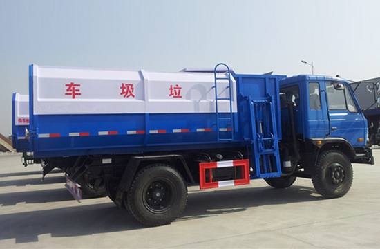 工作原理:自装卸式垃圾车是由密封式垃圾厢、液压系统、操作系统组成,能配几十个垃圾桶,实现一车与多个垃圾桶联合作业,厢体上的液压升降装置可将垃圾桶吊上、放下,上下升降,上下一次工作循环时间为50S,密封式厢体环保卫生,可避免二次污染。其自装式的挂桶装置可直接将路边的垃圾桶挂在上面用提升机直接到在垃圾箱体里面省去了装垃圾的麻烦。