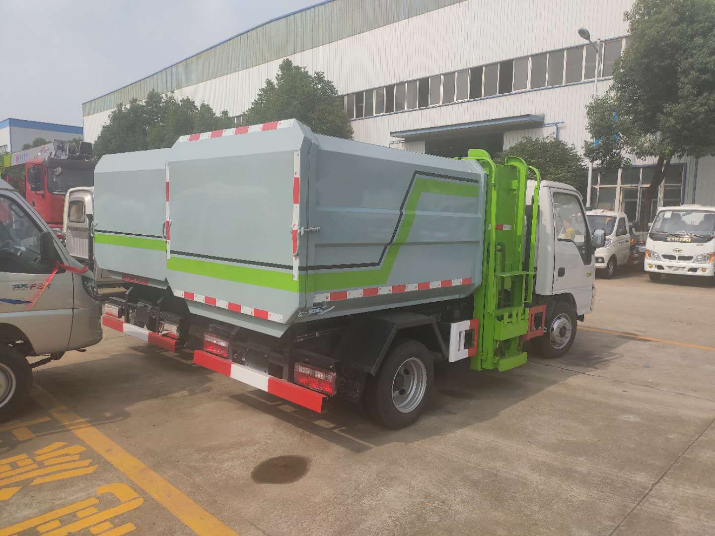 工作原理:自装卸式垃圾车是由密封式垃圾厢、液压系统、操作系统组成,能配几十个垃圾桶,实现一车与多个垃圾桶联合作业,厢体上的液压升降装置可将垃圾桶吊上、放下,上下升降,上下一次工作循环时间为50S,密封式厢体环保卫生,可避免二次污染。其自装式的挂桶装置可直接将路边的垃圾桶挂在上面用提升机直接到在垃圾箱体里面省去了装垃圾的麻烦。
