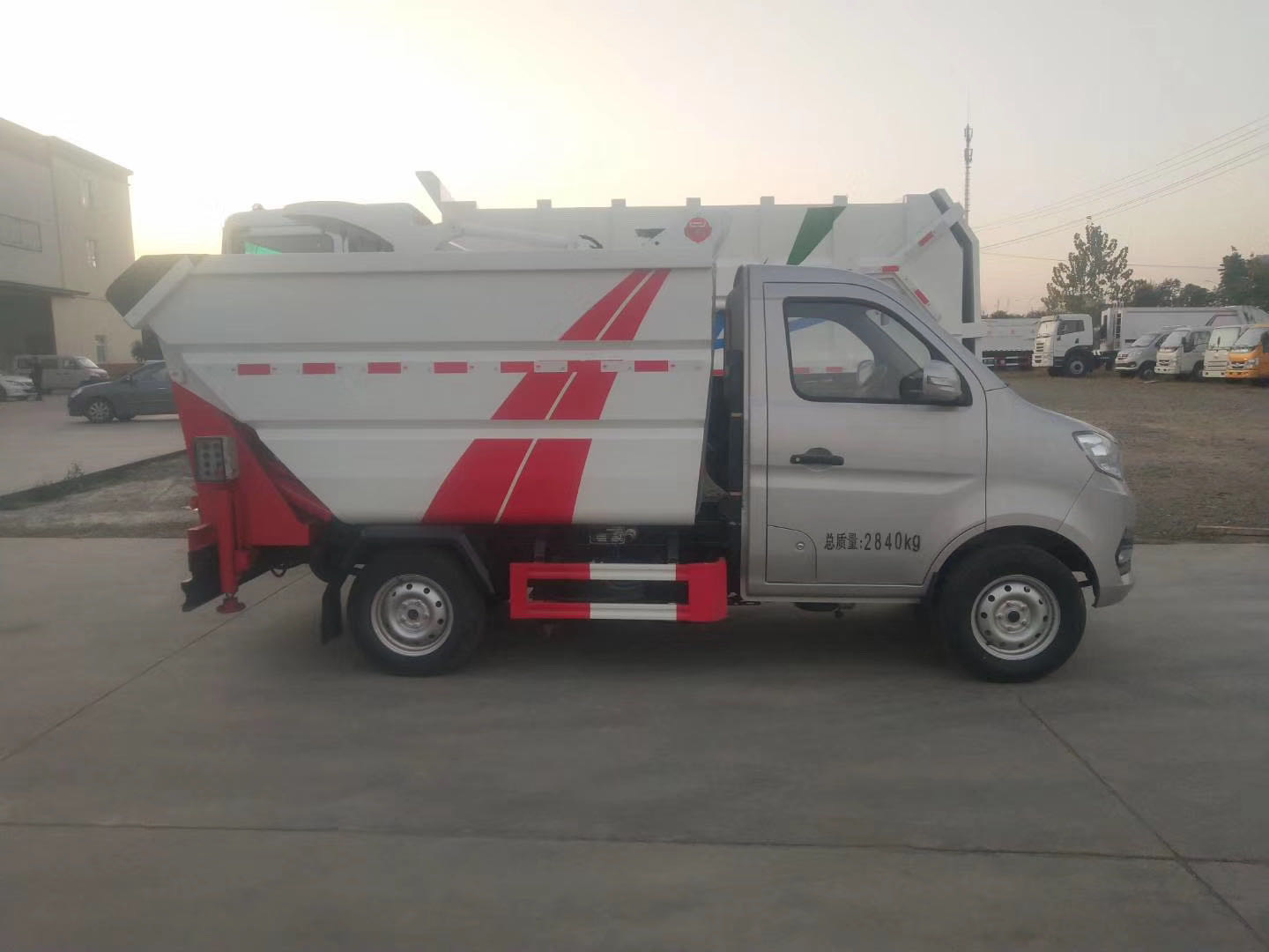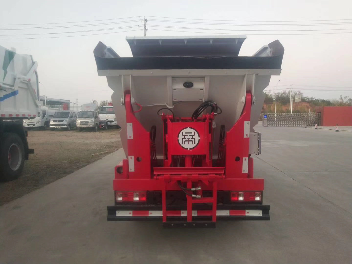 工作原理:自装卸式垃圾车是由密封式垃圾厢、液压系统、操作系统组成,能配几十个垃圾桶,实现一车与多个垃圾桶联合作业,厢体上的液压升降装置可将垃圾桶吊上、放下,上下升降,上下一次工作循环时间为50S,密封式厢体环保卫生,可避免二次污染。其自装式的挂桶装置可直接将路边的垃圾桶挂在上面用提升机直接到在垃圾箱体里面省去了装垃圾的麻烦。