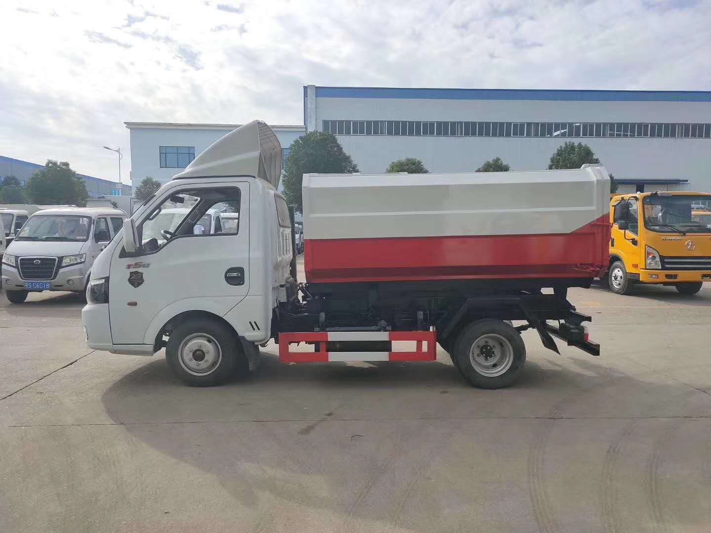 工作原理:自装卸式垃圾车是由密封式垃圾厢、液压系统、操作系统组成,能配几十个垃圾桶,实现一车与多个垃圾桶联合作业,厢体上的液压升降装置可将垃圾桶吊上、放下,上下升降,上下一次工作循环时间为50S,密封式厢体环保卫生,可避免二次污染。其自装式的挂桶装置可直接将路边的垃圾桶挂在上面用提升机直接到在垃圾箱体里面省去了装垃圾的麻烦。