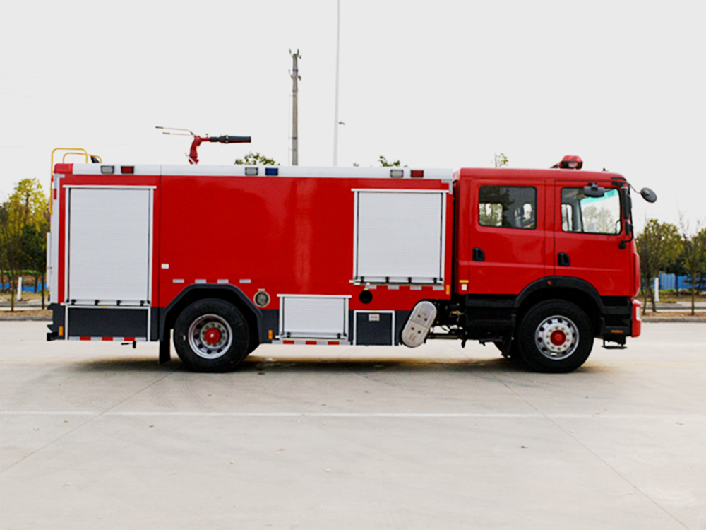 消防泵在箱体中间或者后置,泵房左右两侧4个出水口、器材箱左右后侧均有新款易拉高强度铝合金卷帘门。